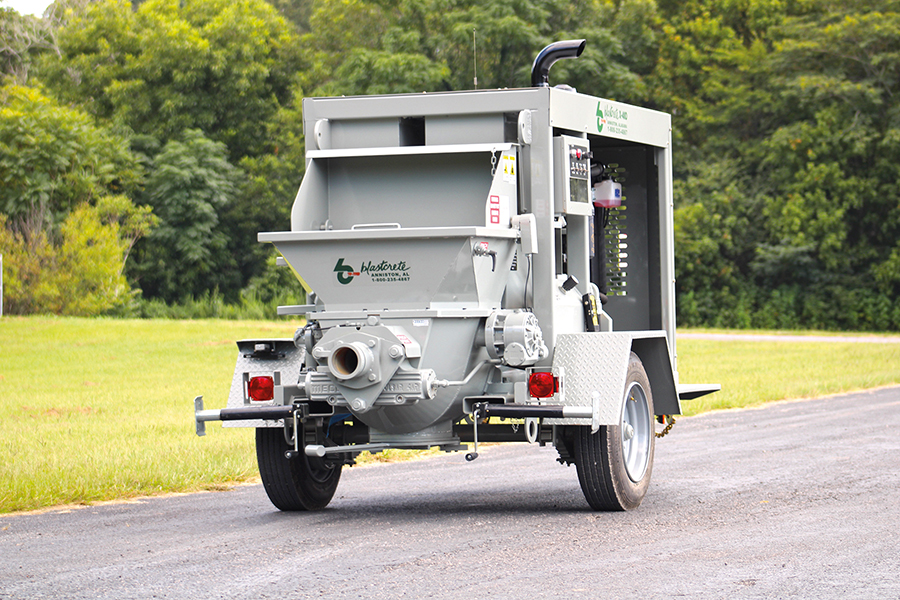 Montado em reboque, o sistema Blastcrete X-40D traz design compacto capaz de lidar com misturas de agregados de até 1,5”. A bomba oferece operação por controle remoto e opcionais como sistema de lubrificação automática e vibrador de tela de 12 VCC, com opções de motores a diesel (Yanmar 4TNV98CT-NKW de 72 cv ou Deutz TD2.9 de 74 cv) e elétricos de 75 cv.