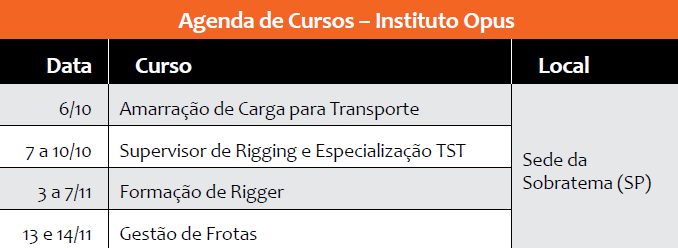 Entre os dias 4 e 8 de agosto, o Instituto Opus de Capacitação Profissional promoveu o curso de Formação de Rigger, em sua sede na capital paulista. Ministrado pelo engenheiro Carlos Gabos, o curso capacitou os alunos na elaboração de planos de içamento de cargas, entre outras habilidades com foco na otimização de recursos e na promoção da segurança operacional.