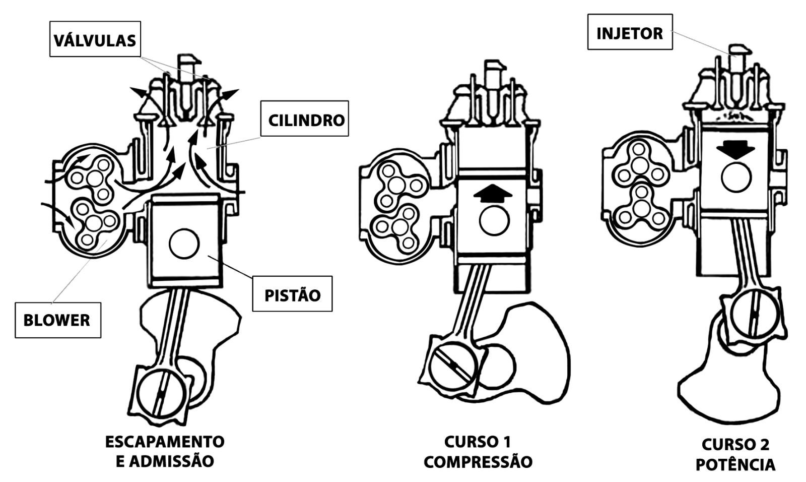 A energia da combustão empurrava o pistão para baixo, até expor as aberturas da camisa, quando as válvulas se abriam iniciando a lavagem e completando o ciclo.