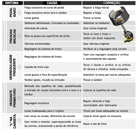Também é recomendável verificar se, na liberação do freio, as molas das sapatas retornam completamente. A substituição das molas de retorno é requerida toda vez que se notar uma folga entre a sapata e o expansor. Os furos para fixação dos rebites também devem ser verificados, pois sua ovalização ou aumento do diâmetro podem igualmente ocasionar lonas soltas pelo esforço de frenagem.
