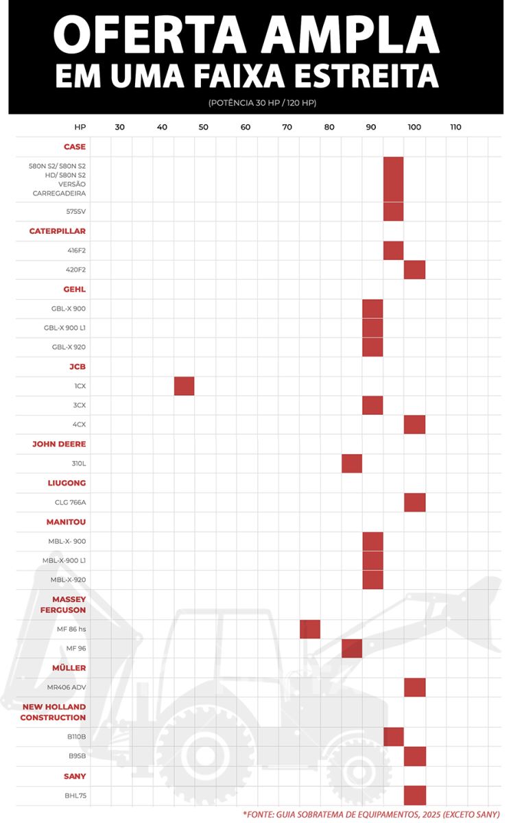 Um dos segmentos mais disputados no mercado brasileiro, a família de retroescavadeiras conta com uma ampla oferta de modelos e marcas no país, incluindo produtos de fabricação nacional e importados, concentrados na faixa de 90-100 hp.