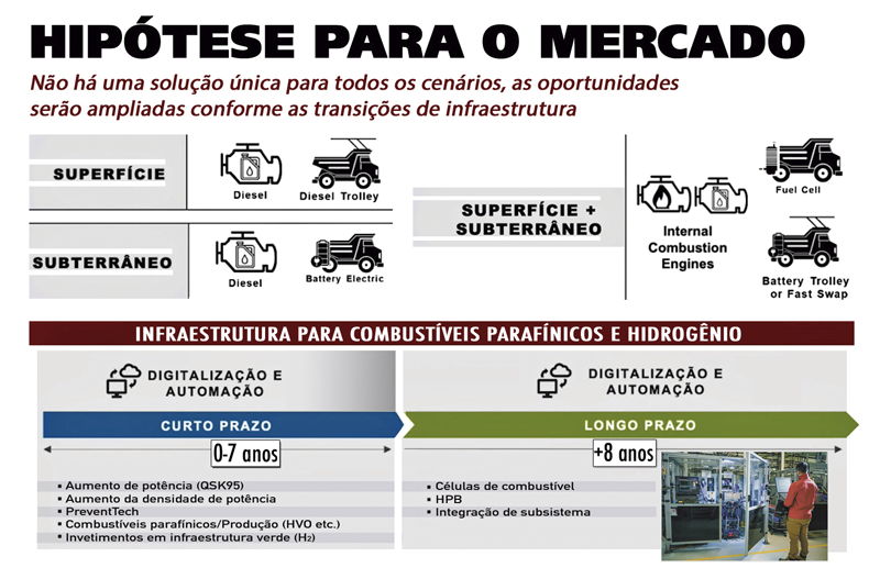 A Cummins projeta que, no curto prazo, as minas de superfície continuarão a usar motor diesel e combinações de diesel com trolley. “Quando começa a subir a rampa, o caminhão toca as linhas, o motor praticamente desliga e o equipamento sobe usando apenas energia elétrica”, descreve. Na parte subterrânea, o motor diesel e veículos elétricos devem se sobressair, com tendência de caminhões maiores e frotas menores, diminuindo a pegada de carbono. Completam o quadro o uso de sintéticos como HVO e investimentos em infraestrutura verde (hidrogênio).