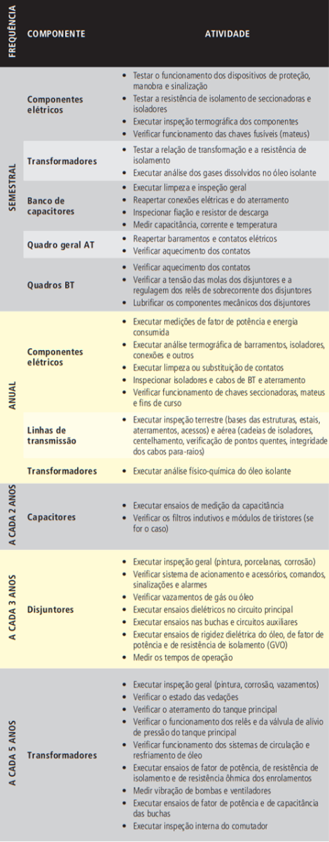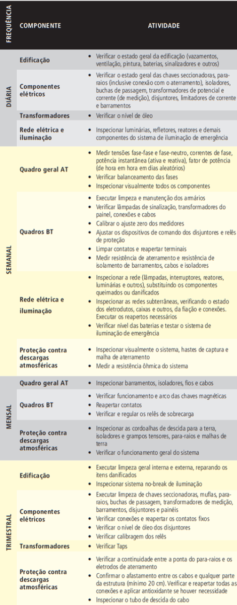 As tabelas que se seguem contêm procedimentos integrados de manutenção preventiva de subestações de média tensão, destinados a assegurar o funcionamento adequado de seus componentes e sistemas, monitorar e evitar falhas e defeitos, corrigindo-os quando necessário.