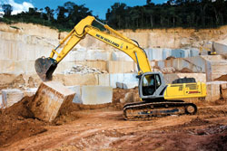 A utilização de carregadeiras de rodas, por sua vez, configura outro tipo de operação. Buffon explica que os produtores de rocha trabalham com blocos de 28 t a 40 t, o que abre o mercado para modelos capazes de carregar peças inteiras, da lavra até o ponto de estocagem ou de partida para o transporte. “No Brasil, a Hyundai oferece carregadeiras com capacidade para até 30 t de carga, equipadas com garfos especiais ou caçambas apropriadas para rochas.” Ele vislumbra uma tendência de os produtores trabalharem com blocos cada vez menores.