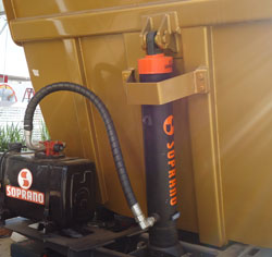 Com bomba hidráulica bi-direcional 115 l/min, válvula direcional 250 l/m, mangueiras de pressão de Ø1.1/4’’ e mangueira de sucção de Ø2’’, o kit hidráulico é vinculado ao cilindro telescópico SC4, que possui amortecimento no retorno, fixação superior soldada (aleta) e fixação inferior com orifício para lubrificação da graxeira.