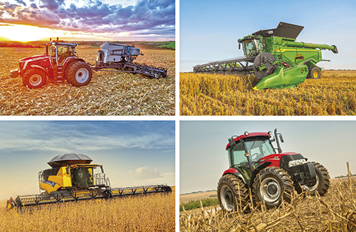 Em sentido horário: o trator Massey Ferguson MF 8S, a colheitadeira John Deere X9, o trator Case Farmall e a colheitadeira New Holland CR Intellisense foram destaques na Agrishow 2023