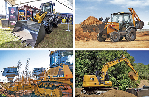 Em sentido horário: a pá carregadeira New Holland W130B, a retroescavadeira Case 580N, a escavadeira Cat 313 e o trator de esteiras Komatsu D61EM representaram a Linha Amarela no evento