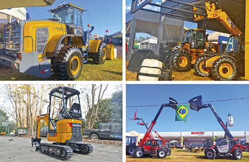 Em sentido horário: a XCMG mostrou máquinas como a carregadeira elétrica XC968-EV, enquanto a JCB e a Manitou exibiram manipuladores e a LuiGong destacou a miniescavadeira 9017F, dentre outros produtos