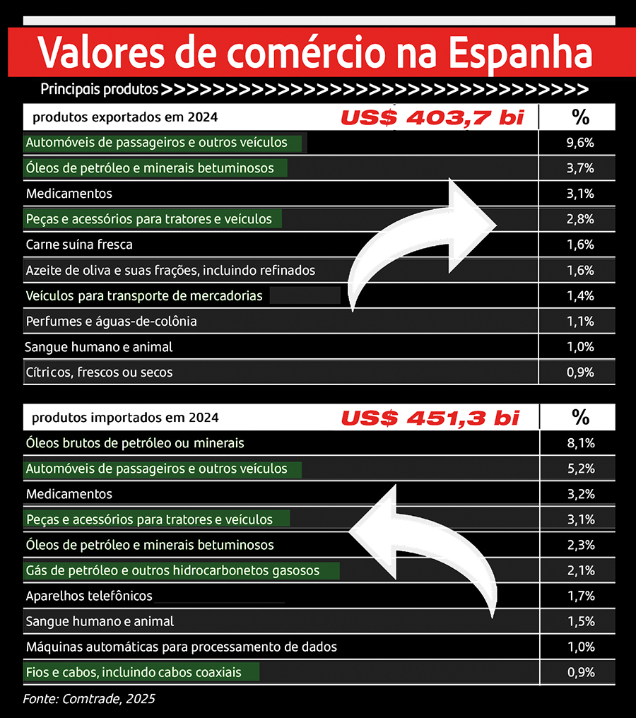 Nos últimos dez anos, o mercado brasileiro acumula um histórico de US$ 100 bilhões em comércio bilateral com a Espanha, de quem adquire principalmente equipamentos de transporte, produtos químicos, máquinas e aparelhos mecânicos (v. quadro).