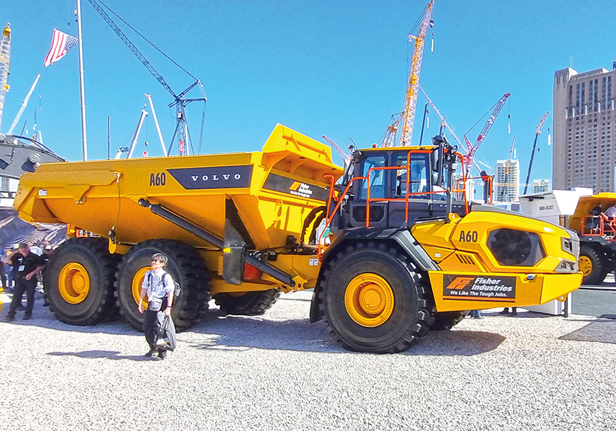 Maior fora de estrada da linha de articulados, o caminhão A60 liderou a exposição da Volvo CE. Imagem: MARCELO JANUÁRIO