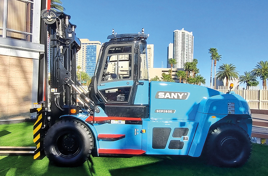 A empilhadeira elétrica SCP160E chamou a atenção dos visitantes no estande da Sany. Imagem: MARCELO JANUÁRIO