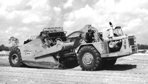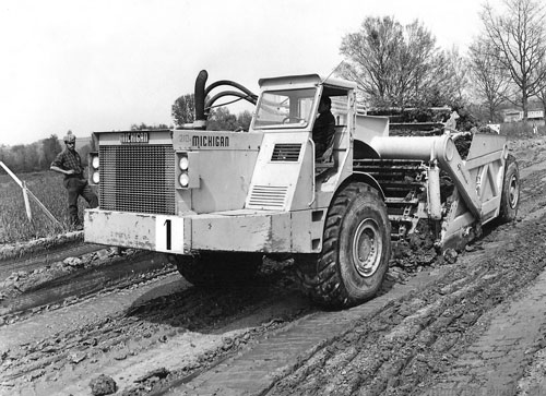 Com três modelos, a linha inaugural de motoscrapers da Michigan foi lançada em 1957. Nesta imagem, vê-se o modelo 210, de 13,7 metros cúbicos