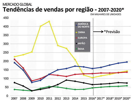 Na Europa, foco estratégico do evento, a previsão é de um tímido crescimento do mercado, mantendo uma média de 132.322 unidades no período que vai deste ano até 2020. O destaque global continua com a Índia, que – pelas projeções – inicia um ciclo de cinco anos de crescimento consistente. “A Índia deve chegar a 2020 com um mercado de 60 mil unidades, em um recorde histórico de vendas”, disse Phillips, referindo-se ainda à média de 52 mil unidades que podem ser comercializadas naquele país no período 2017-2020.
