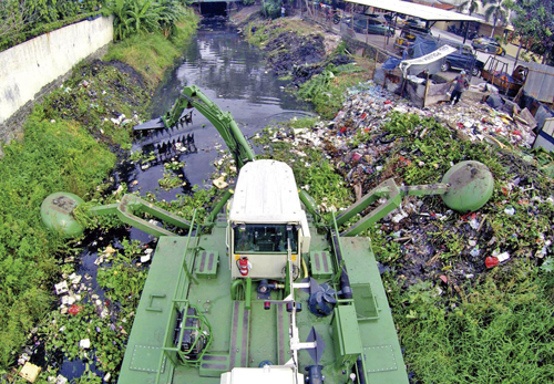 Uma solução interessante para obras de dragagem são as escavadeiras anfíbias, utilizadas para remoção de materiais como galhada, lixo e rochas. O principal diferencial do equipamento é a mobilidade na água, assim como em terrenos alagados e pantanosos. Com boias instaladas no material rodante, as máquinas são autopropulsadas pelas próprias esteiras.