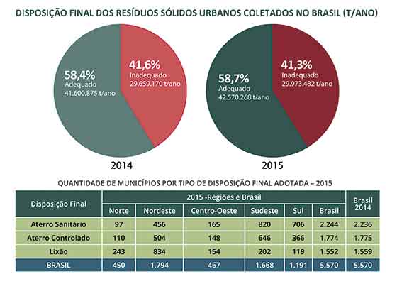Os lixões já deveriam ter sido extintos em 2014, conforme determinado pela Política Nacional de Resíduos Sólidos. A situação piora com o aumento da quantidade de resíduos gerados pela população brasileira, que de 2014 a 2015 passou de 78,6 para 79,9 milhões de t. Os dados são da Associação Brasileira de Empresas de Limpeza Pública e Resíduos Especiais (Abrelpe) e surpreendem por terem sido obtidos num período em que o país já atravessava um período de crise econômica.