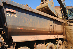 Segundo a empresa, os caminhões da TSL (8x4) podem carregar até 38 toneladas quando estão equipados com a caçamba meia-cana da Rossetti. Para aferir a produtividade, cada caminhão é pesado antes de descarregar o material no britador primário ou na pilha pulmão para ele.