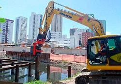 Para agilizar a instalação de vigas H nas fundações das obras de construção de pontes de trabalho nos manguezais de Recife (PE), a construtora Queiroz Galvão empregou o cravador de estacas, vigas e tubos Movax Side-Grip vibro.
