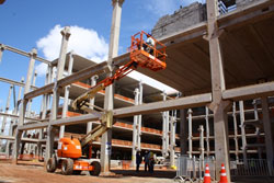 Ao todo, 11 plataformas aéreas operam no empreendimento, seis delas locadas para a Troza Montagens e Estruturas, executando a montagem da estrutura do telhado dos galpões.