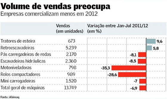 O quadro é semelhante para a Sotreq, distribuidora de máquinas Caterpillar. A empresa estima ter vendido 10% menos em receita e 5% abaixo em volume no acumulado do ano, na comparação com igual intervalo de 2011.
