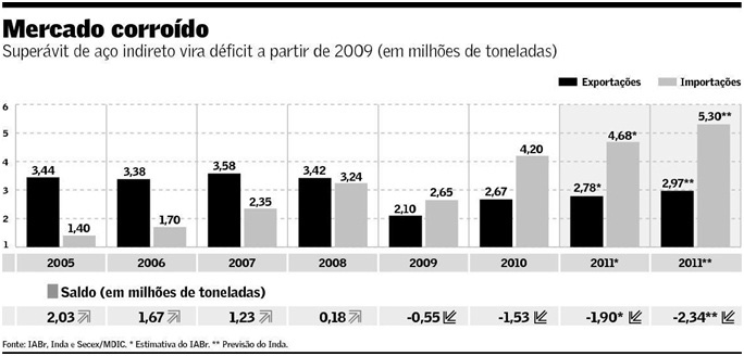 Conforme dados do IABr, o Brasil vai fechar com déficit de quase 2 milhões de toneladas na balança comercial de aço indireto prevista para o ano. "Em 2005, o país tinha superávit desse mesmo volume", informa Lopes. Ou seja, em seis anos o setor está perdendo um mercado próximo de 5 milhões de toneladas de aço bruto para usinas siderúrgicas estrangeiras, em especial da China. É de lá, maior país siderúrgico do mundo, que tem vindo a maioria de bens acabados em aço da cadeia metalmecânica.