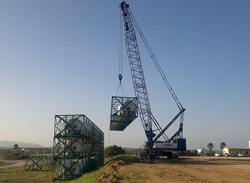 Instalado no pátio de armazenamento da Suzlon na cidade de Caucaia, na Região Metropolitana de Fortaleza (CE), o equipamento de 250 toneladas movimentou pás eólicas para dar espaço às nacelles (compartimentos instalados no alto da torre e que abrigam todo o mecanismo do gerador), nose cones, hubs e contêineres trazidos do Porto de Mucuripe, também no Ceará.