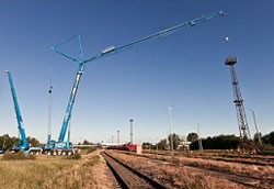 Para realizar a delicada tarefa, a empresa utilizou um guindaste todo terreno Terex AC350/6 e um modelo auxiliar Terex AC 80, que atuou em uma exigente operação de içamento tandem. Além do desafio de içar as pesadas peças em um raio de trabalho de 63 m, o prazo previsto para a operação era extremamente apertado, de modo a interromper o mínimo possível o tráfego na ferrovia.