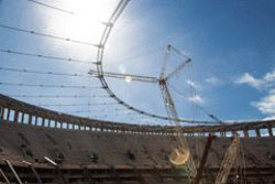 O guindaste de esteiras CC 2800-1 da Terex, com 600 toneladas de capacidade de carga está sendo utilizado para colaborar com a colocação da cobertura e ecológica do Estádio Nacional Mané Garrincha que incorpora células fotovoltaicas capazes de gerar toda a energia necessária para o novo local.