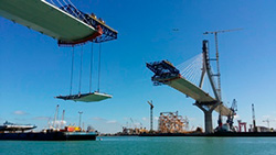 ...Dois guindastes de torre da Linden Comansa têm trabalhado por 8 anos na construção da Ponte da Constituição de 1812, que faz a ligação, desde Setembro de 2015, da cidade de Cádiz com a cidade de Puerto Real, na Espanha.