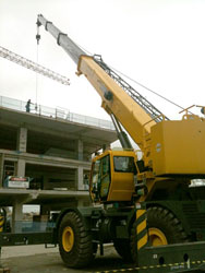 Um guindaste para terrenos acidentados Grove RT765E-2 e um guindaste todo terreno GMK6220L estão no local de trabalho da Arena Corinthians, auxiliando na pré-montagem do estádio.