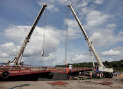 A expansão que se fez foi a duplicação da largura da ponte, adicionando partes pré-fabricadas que foram transportadas em barcaças. Aí começou o desafio da Tomiasi Logística Pesada. Para conseguir vencê-lo, embarcou também os três guindastes Terex todo terreno: um AC 200-1, um AC 350/6 e um AC 500-2.
