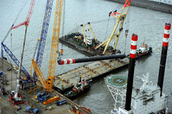 ...Em nome da AG Bremerhaven Lloyd-Werft, o Grupo Sarens recentemente levantou dois conjuntos de quatro pernas jackup para dois navios de instalação offshore pertencentes a RWE OLG GmbH, uma empresa de logística que faz parte da RWE Innogy, no porto livre de Bremerhaven.