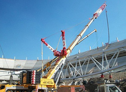 “Cada mastro tem 90 m de altura e pesa 350 ton. O guindaste AC 700 forneceu a elevação e o manuseio necessários a um trabalho tão difícil quanto delicado", explicou Vernazza. "Ao erguer os mastros utilizando a própria estrutura como escora, nós pudemos posicioná-los no ângulo exato antes de fixá-los.”