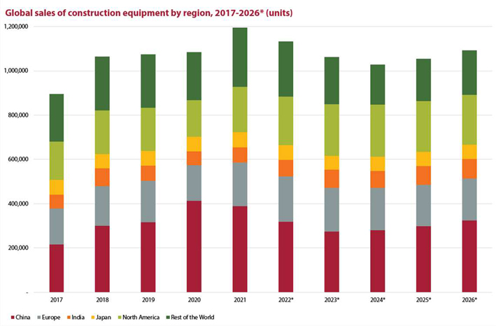 As vendas globais de equipamentos para construção aumentaram 10% em 2021, atingindo um nível recorde de 1,1 milhão de unidades ao redor do mundo, de acordo com dados da consultoria Off-Highway Research, recentemente atualizado.