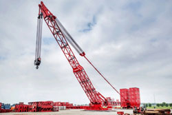 Patrick van der Meide, Mammoet, gerente comercial sênior, explica que o MTC15 é uma grua terminal móvel com capacidade de 600 t, com uma carga nominal máxima, que até o momento é de 15.000 toneladas-metros.