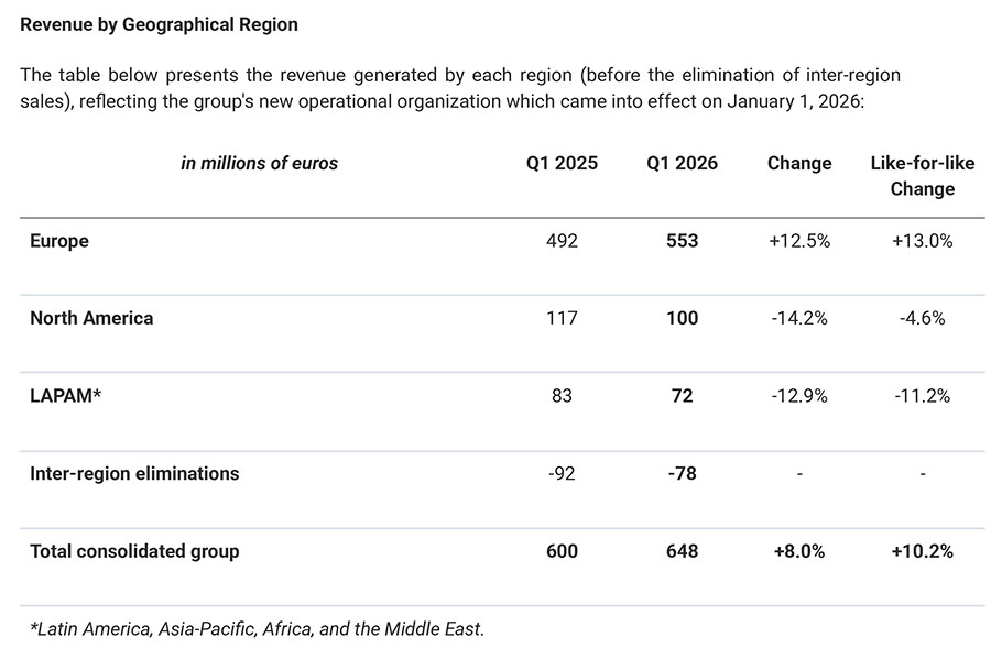 Na América do Norte, a receita foi de 100 milhões de euros, recuo de 14,2% causado por taxas alfandegárias e variações cambiais.