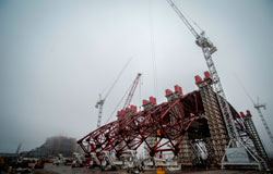 Segundo a empresa, todos estão trabalhando oito horas por dia para levantar estruturas metálicas, que pesam até 16 t para criar uma estrutura em forma de arco que pesa 29.000 t.