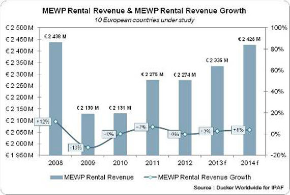 O mercado europeu de locação/aluguel de PEMPs/PTAs nos 10 países pesquisados (Dinamarca, Finlândia, França, Alemanha, Itália, Países Baixos, Noruega, Espanha, Suécia e Reino Unido) manteve-se estável em 2012 (+0%) e é avaliado em cerca de 2,3 bilhões de euros, de acordo com o Relatório.