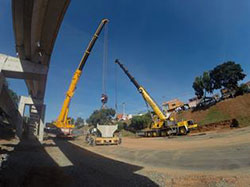 Destaque na locação de equipamentos para movimentação de cargas, transporte pesado e remoção industrial, a Cunzolo Guindastes e Plataformas realizou no último mês em Itupeva, São Paulo, o carregamento, transporte e montagem de uma passarela com 35 m de comprimento, 1,8 m de largura, 1,8 m de altura e 106 ton.