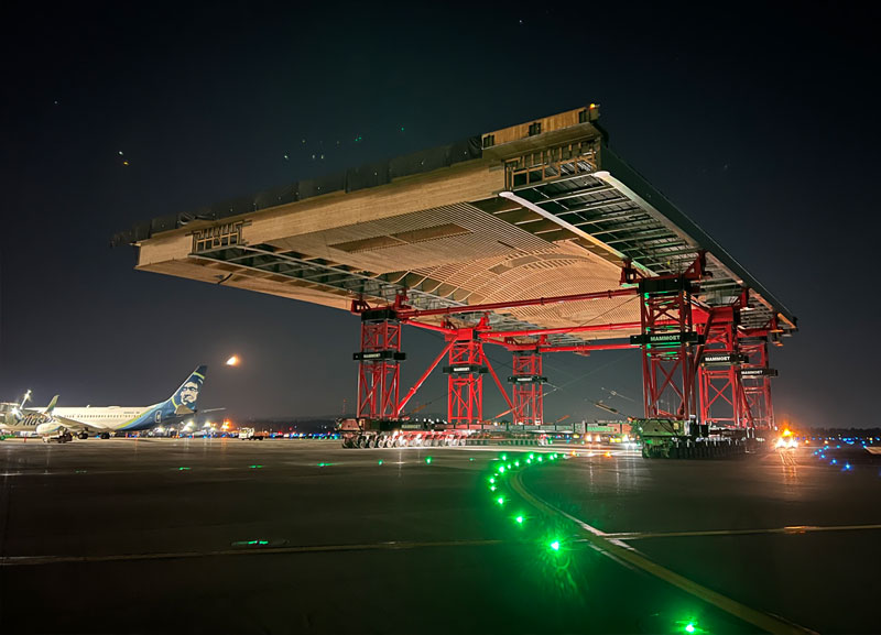 Antes de serem movidos, os painéis foram divididos em peças que pesam entre 40 t e 632 t, com dimensões de até 72 m x 50 m x 6 m, o que permitiu que o aeroporto continuasse a operar como de costume, minimizando a interrupção das operações.