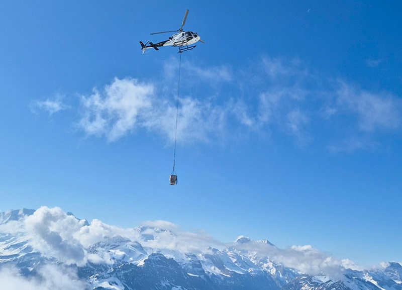 Em uma operação cinematográfica no Monte Niesen, na Suíça, a construtora Marti AG Bern precisou transportar a vibroacabadora Vögele Mini 500 por meio de teleférico até uma estação e, depois, abastecê-la com massa asfáltica usando um helicóptero.