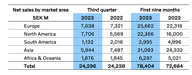 No 3º trimestre, as vendas líquidas totalizaram SEK 24,29 bilhões, um leve aumento em relação aos SEK 24,23 bilhões obtidos no mesmo trimestre do ano passado.