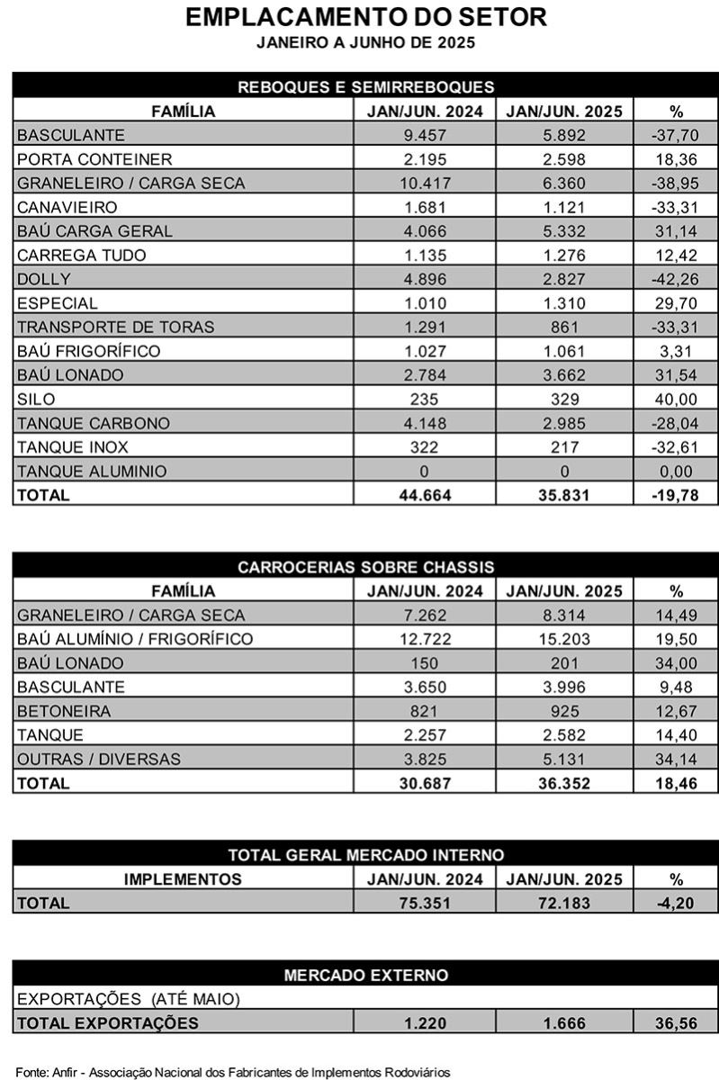 No 1º semestre, o desempenho de emplacamentos do setor de implementos rodoviários ficou 4,2% abaixo de igual período apurado no ano anterior.