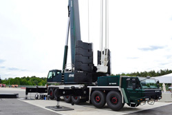 O guindaste é montado sobre chassi, acionado por um motor de oito cilindros Mercedes OM, que atinge 653hp de potência.