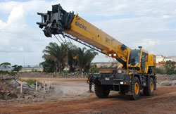 Segundo a empresa, todos estes guindastes para terrenos acidentados são configurados com dois guinchos e recuos principais e auxiliares.