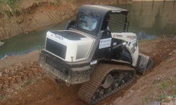 Três operadores da Tauron trabalharão com as máquinas compactas da Terex numa área de difícil acesso. Eles farão a limpeza dentro das aduelas do trecho canalizado do Ribeirão Eusébio, locais onde máquinas de grande porte e sem esteiras não conseguem trabalhar.