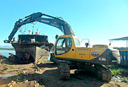 Acoplada a uma escavadeira hidráulica Volvo EC240B LC, a tesoura hidráulica realizou a desmontagem dos navios deteriorados, que não poderiam ser retirados do local de outro modo. “Este projeto foi um grande desafio, pois uma das embarcações ainda estava parcialmente dentro da água”, destacou Anselmo d’Almeida, diretor da MNO Equipamentos.