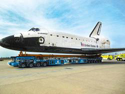 Do Aeroporto Internacional de Los Angeles para o seu destino permanente, o ônibus espacial foi transportado em veículos modulares pesados fornecidos por especialistas em transportes da Sarens. O fabricante destes transportadores autopropulsados é o produtor alemão de veículo, KAMAG Transporttechnik, localizado em Ulm, na Alemanha.