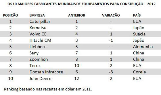 Em contrapartida, a japonesa Hitachi Construction Machinery e a sul-coreana Doosan Infracore caíram de posições. Já a chinesa XCMG, que ocupou o décimo lugar por dois anos, deixou o top ten.